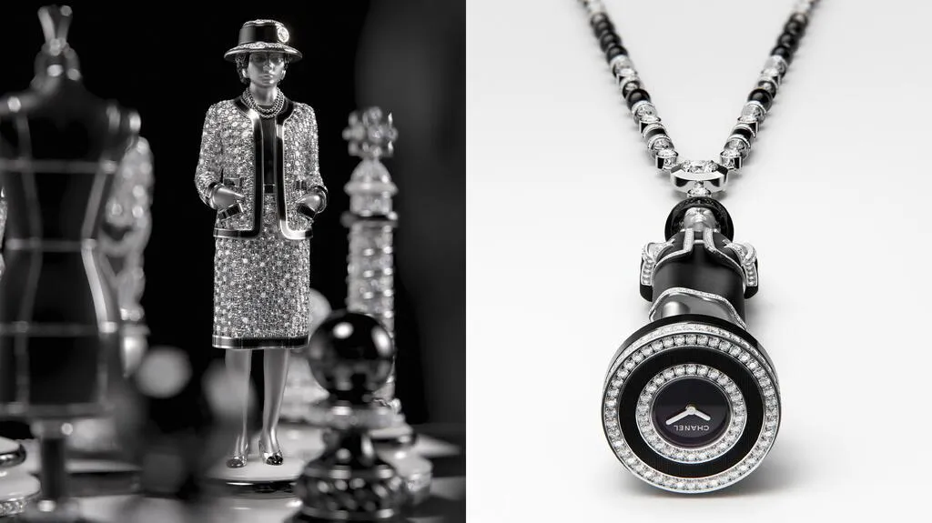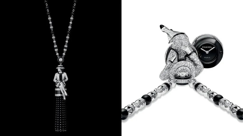 Коллекция также включает «Gabrielle» long necklace — изящное ожерелье из 18-каратного белого золота с черным лаком, бриллиантами и ониксом. Ограниченное пятью экземплярами, оно изображает Коко Шанель в ее культовой позе. Фигурка, украшенная 731 бриллиантом, сидит на помпоне из 256 бусин оникса, который сдвигается, открывая циферблат часов.