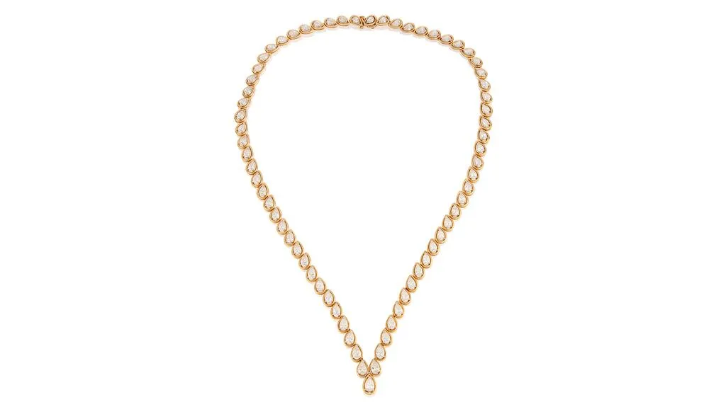 - 1977 Oscar Heyman & Brothers for Cartier: колье из 18-каратного золота и платины, украшенное 69 бриллиантами грушевидной огранки общим весом около 24,15 карата. Оценочная стоимость: $20 000 – $30 000.