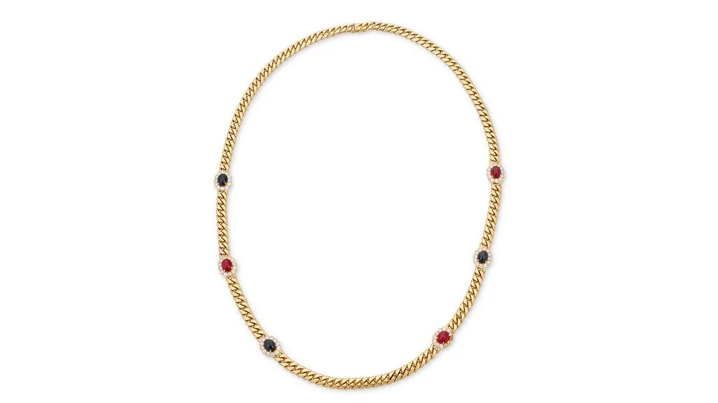 - Золотое, эмалевое колье с рубинами и бриллиантами: оценочная стоимость: $12 000 – $18 000.