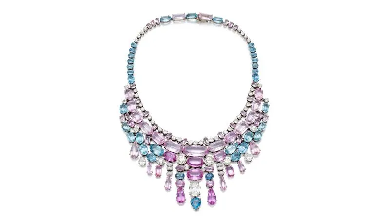 - Колье-биб от Suzanne Belperron, украшенное топазом, морганитом, аквамарином и бриллиантами, ушло с молотка за 825 500 долларов, более чем в два раза превысив верхнюю границу оценки.