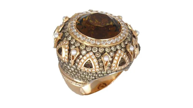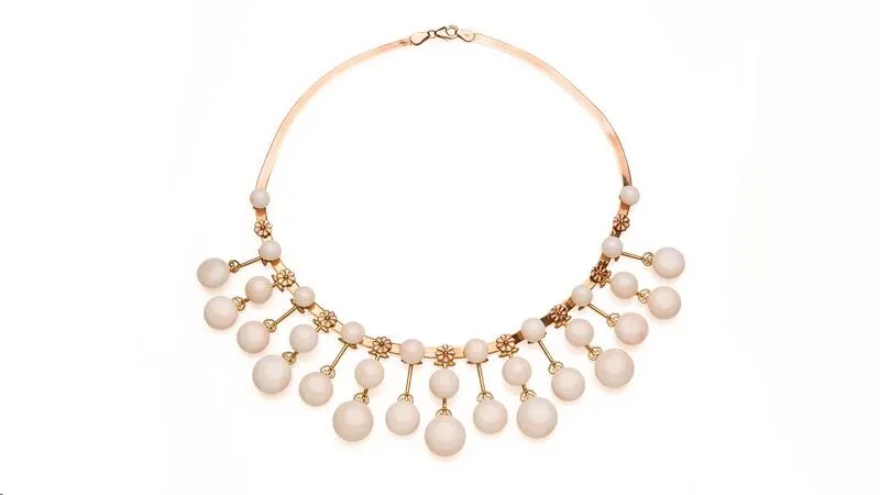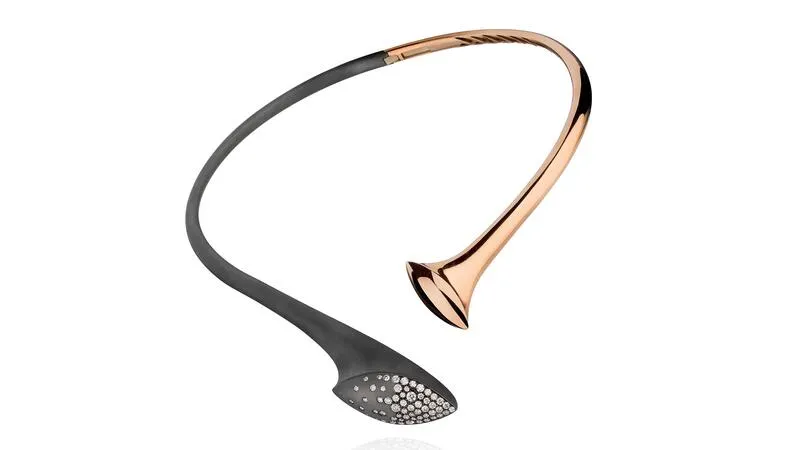Среди представленных шедевров – колье из розового коралла и 18-каратного золота от Antonio De Simone, кольцо «Медуза» от Grimoldi Milano из розового золота с крупным коньячным кварцем, бриллиантами и жемчугом, а также колье «Abbraccio» от J Jewels, выполненное из розового золота, титана и украшенное бриллиантами.