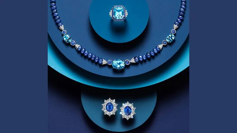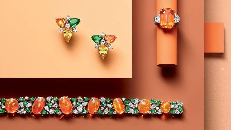 Центральная тема каталога — празднование цвета и ювелирного мастерства. Это ярко выражено в монохромных главах, где фоновые оттенки гармонично сочетаются с цветом драгоценных камней в каждом изделии.