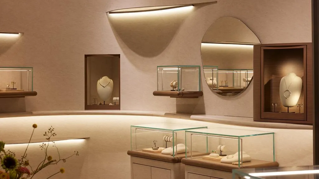 Бутик выполнен в нейтральной цветовой гамме с элегантными стеллажами. В стеклянных витринах представлены как повседневные украшения, так и эксклюзивные скульптурные designs от бренда.