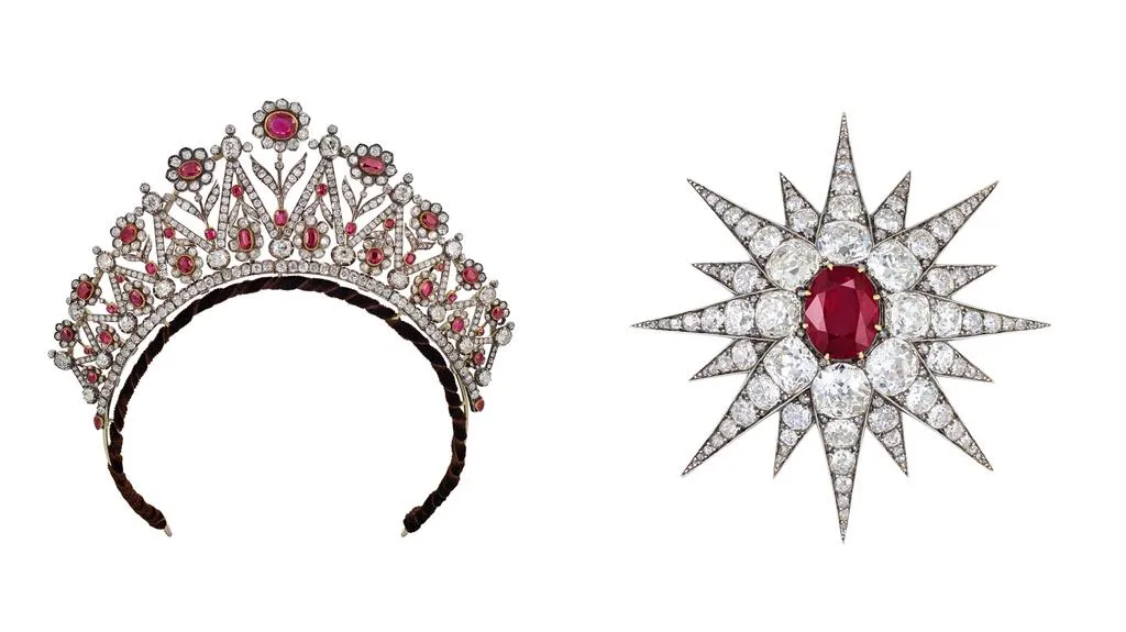 Также будут предложены три частные коллекции. "A Splendid Casket of Ancestral Jewellery" представит рубиновые украшения из собрания Третьей графини Стрэдброк (1874-1949). Среди них тиара и брошь, которые графиня носила на коронации Эдуарда VII в 1902 году.