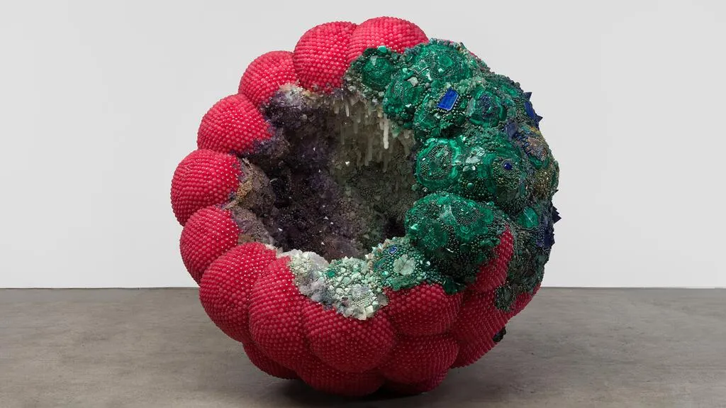 В галерее Karma в Лос-Анджелесе представлена выставка "Souvenir" художницы Кэтлин Райан, демонстрирующая крупномасштабные скульптуры фруктов и предметов быта, украшенные драгоценными и полудрагоценными камнями.