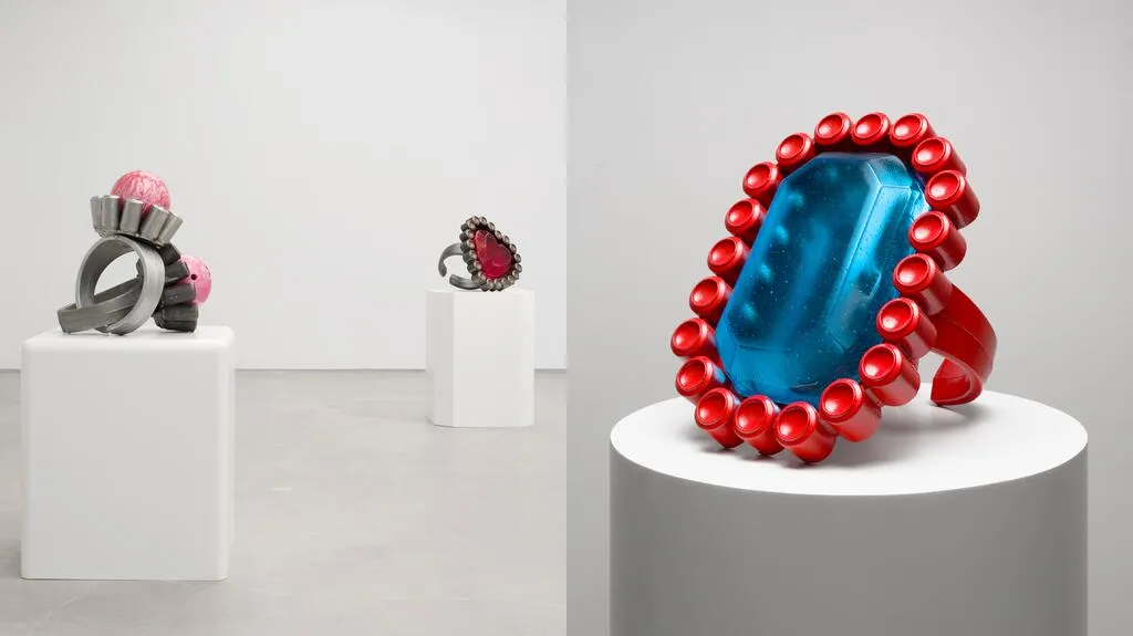 Помимо скульптур, инкрустированных камнями, выставка включает серию гигантских колец. Их "драгоценные" камни выполнены из бильярдных шаров и граненого стекла, окруженных ореолом из пивных банок. Кольца имеют размеры, рассчитанные на человеческую талию, а не на палец, и напоминают детские игрушки из тематических вечеринок.